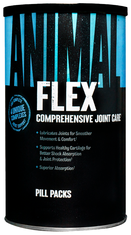 Animal Flex - это полный «базовый» комплект необходимых ингредиентов, разработанный специально для поддержания здоровья суставов и связок профессиональных спортсменов - пауэрлифтеров и бодибилдеров. Никаких сложных схем приема - всего один пакетик в день, чтобы всегда чувствовать уверенность на силовых тренировках. Animal Flex состоит сразу из нескольких ключевых ингредиентов, влияющих на суставы и соединительную ткань.